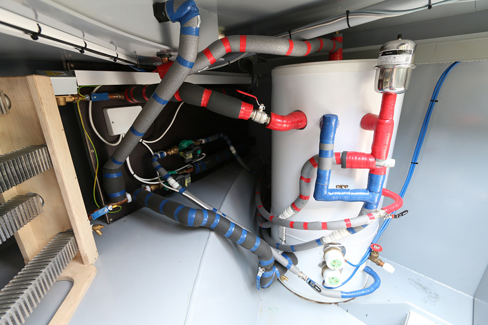 Working with the owners we created the specification together. She has 20KW V twin Lynch 48V DC motor, almost 4KW of solar panels and wood burning Rayburn for cooking and heating in the winter. Summer cooking is achieved on an induction hob and electric oven.